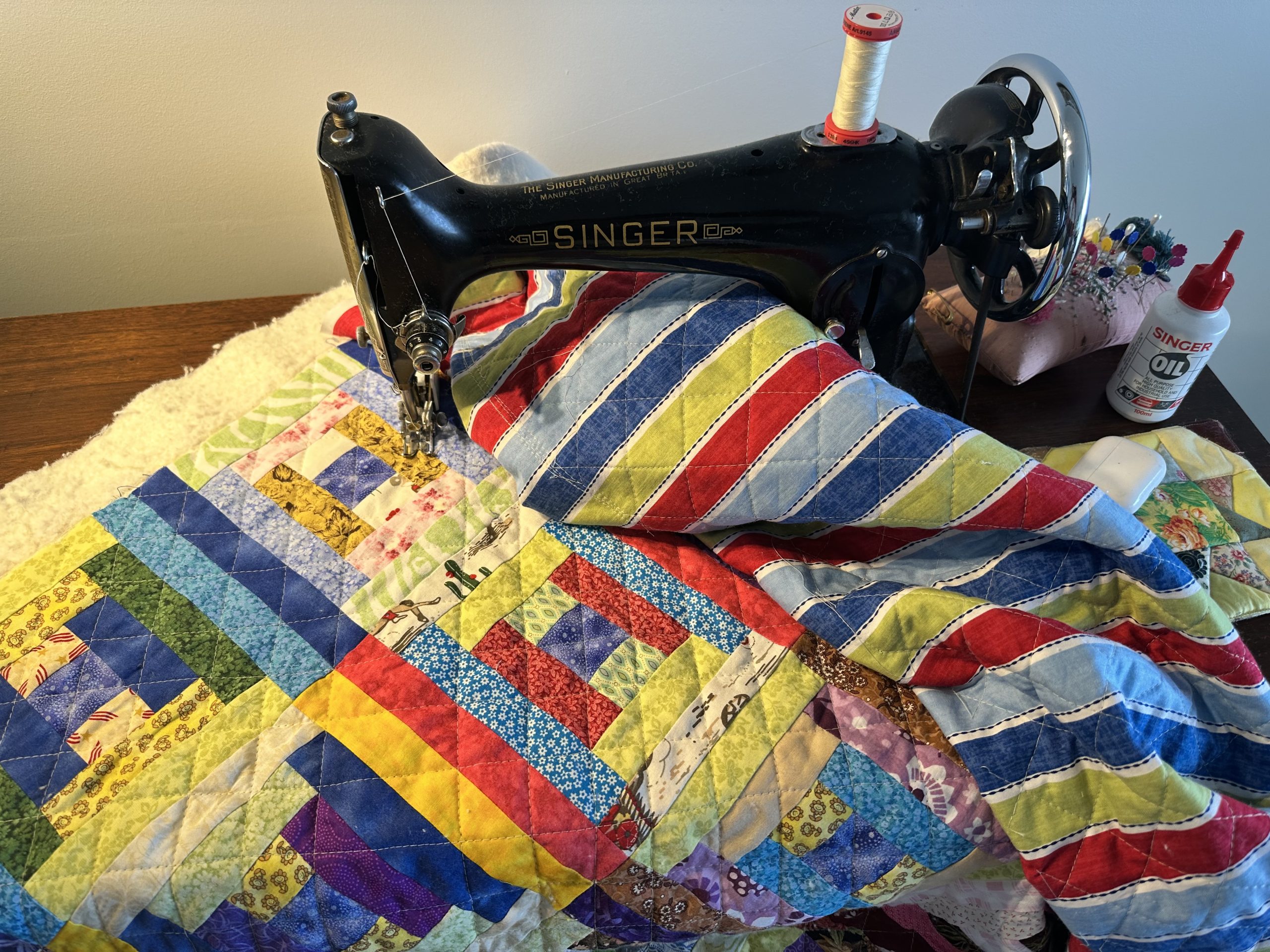 With the machine working well it is a very nice stress-free way to do the quilting. I think it’s important to say. I have not marked the quilt. I used plenty of pins to base it and then, using the design of the quilt to quilt it in a cross hatch pattern. Therefore, I can use the seam intersections as my guide. I’m using the longest stitch length and I use gardening gloves as I would for free motion quilting with the tips cut off..Cockle Quilting by Treadle Tutorial