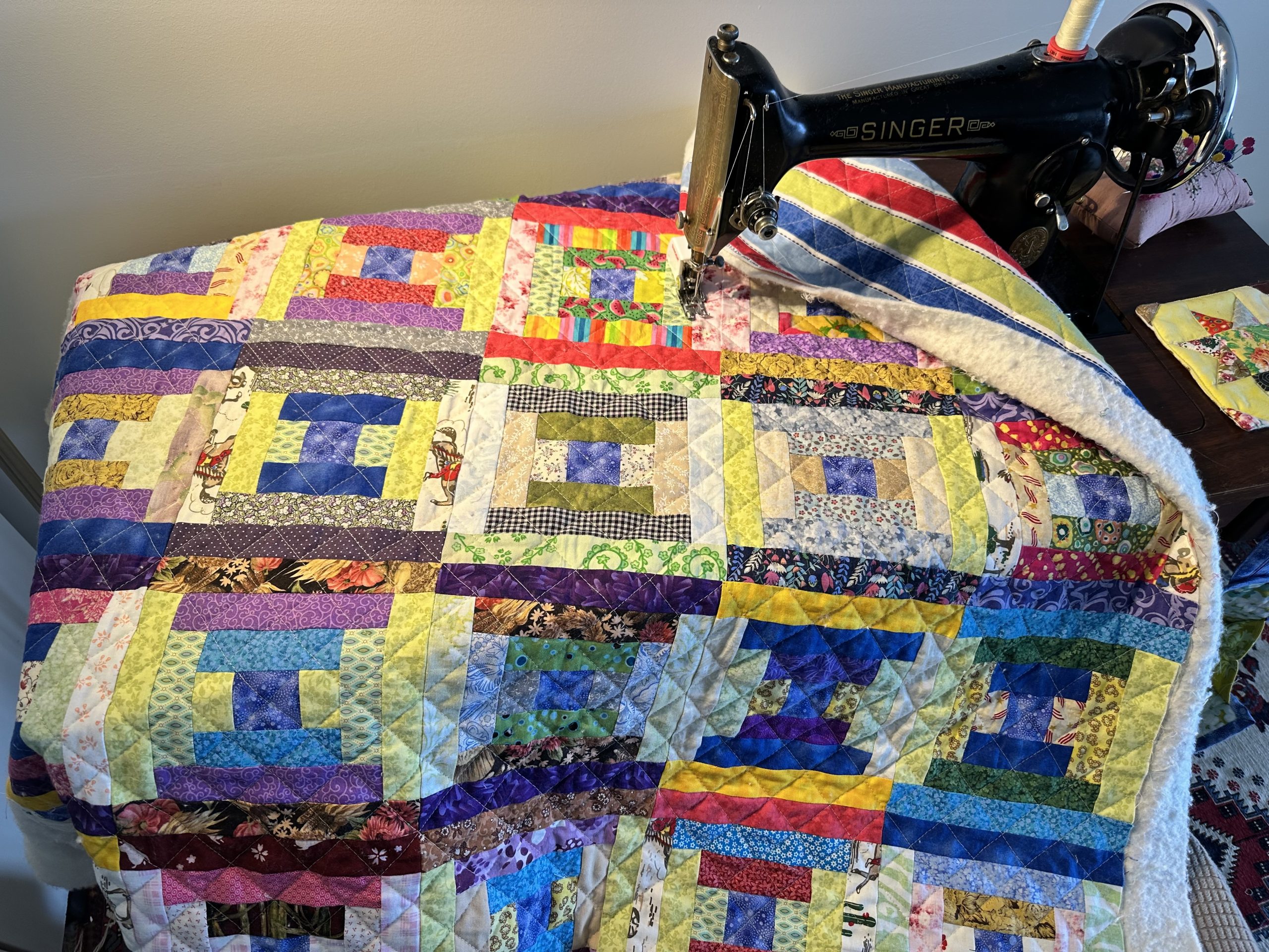 As it is a Courthouse Steps pattern, I decided to just quilt it all with straight line quilting, using a walking foot.. I am doing the quilting on a Singer treadle machine. Singer 201K Treadle C1947. I’m am using an improvised method of straight line quilting. The lines are not perfectly straight nor is the spacing perfect. Here is how it looks after the first set of cross hatched lines are completed.